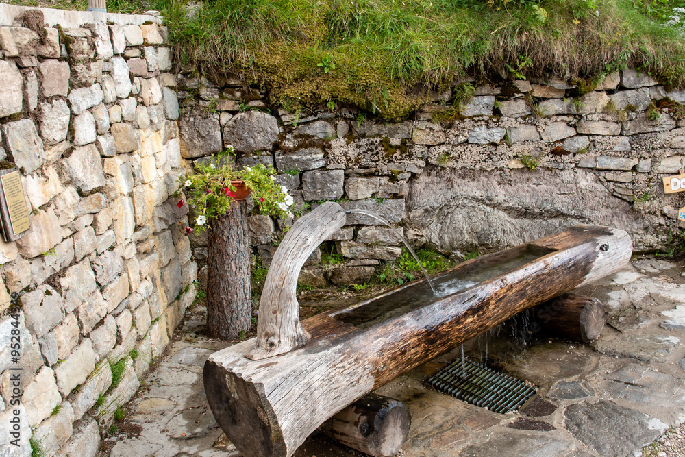 Fountain-drinking trough dug into a tree trunk at the Contrin refuge, Marmolada