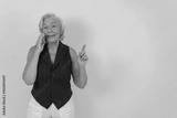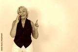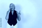 A cheerful older woman with silver hair is talking on the phone, happily expressing her positivity and joy