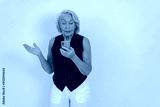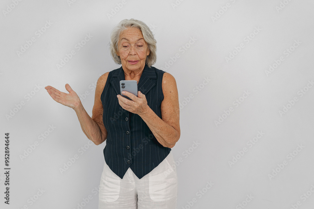 An elderly woman interacts with a smartphone, expressing curiosity and engagement in a studio setting.