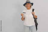A cheerful senior woman is all set for an exciting adventure, equipped with her trusty backpack and travel card