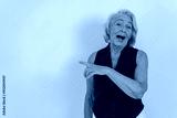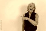 A joyful elderly woman engaging with great enthusiasm while pointing and smiling cheerfully against a plain backdrop
