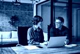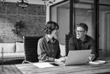 Two happy busy professional executives team business people working together on laptop computer in modern office at corporate meeting. Professional bank manager consulting company client at work.