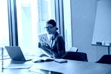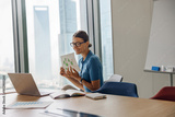 A focused professional woman is engaged with her book while skillfully working on a laptop in her sleek office