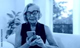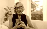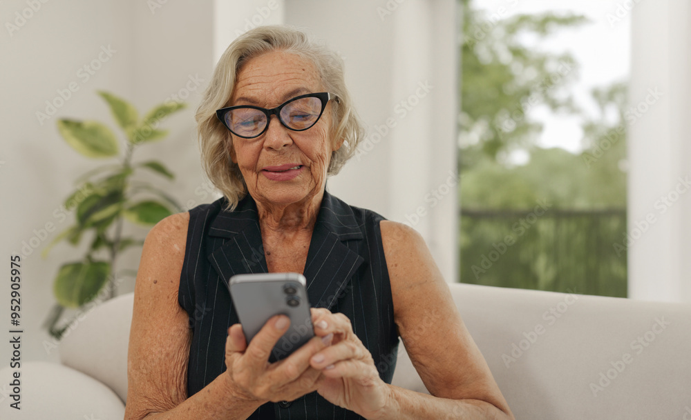 A senior woman is happily enjoying the use of her smartphone in a stylish, bright, and comfortable living space
