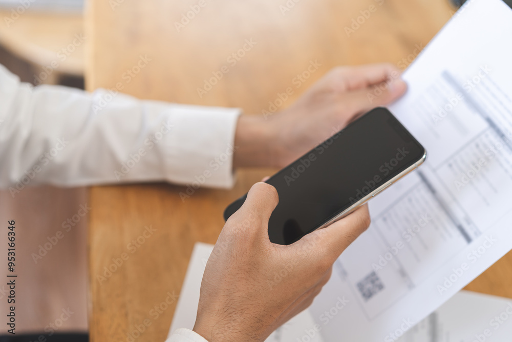 Bill pay concept. Online internet banking asian young man hand holding invoice use mobile smart phone spend scan barcode to transfer to pay money of credit card without cash. Technology of financial.