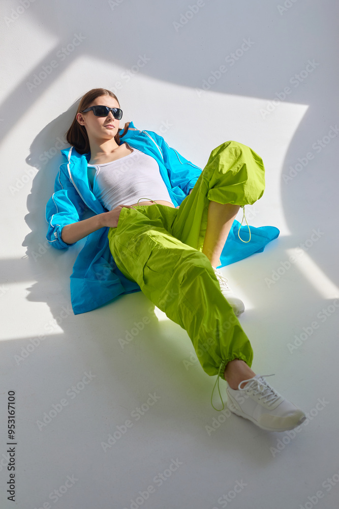 Fashion portrait of young woman in sport jacket and pants.