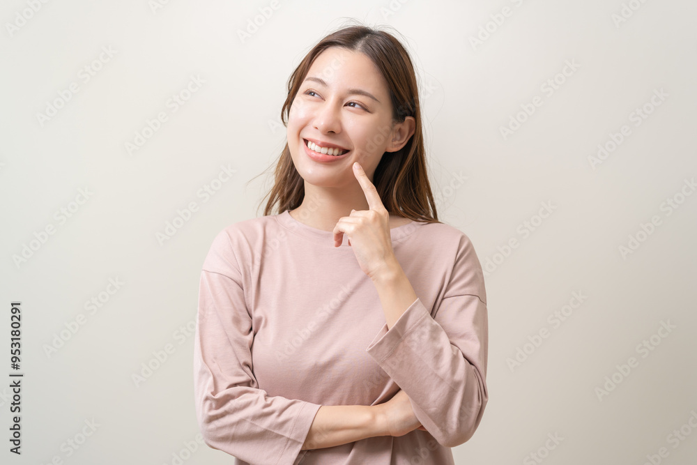Portrait of positive confident thoughtful asian young woman gesture pointing finger, happy girl in casual. Charming female thinking creative, thinks about future, isolated on background, copy space.