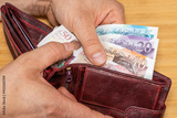 Hand takes out money from the wallet, British Pound banknotes, concept, rising prices, value of English currency