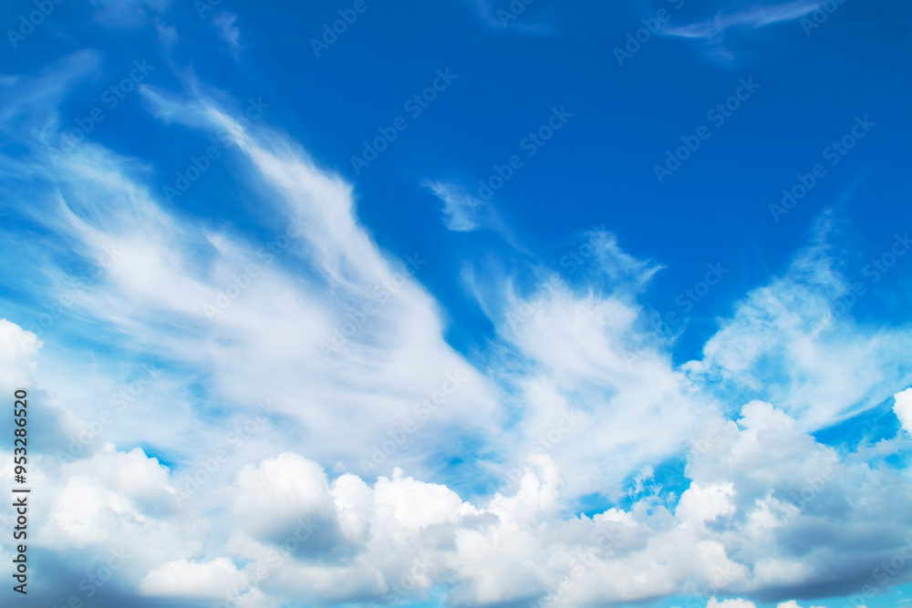 Background with cumulus clouds in summer. Panorama with light blue sky with white clouds.