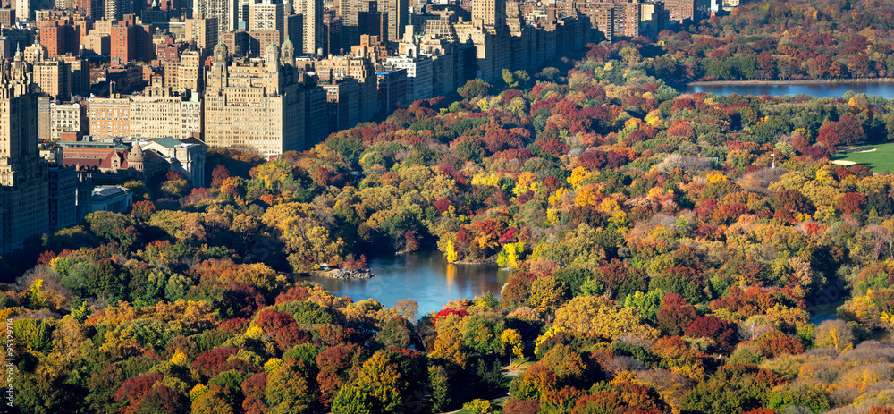 Central Park and Manhattan, Upper West Side with colorful Fall foliage. The aerial view includes buildings of Central Park West, The Lake and the Jacqueline Kennedy Onassis Reservoir. New York City.