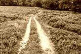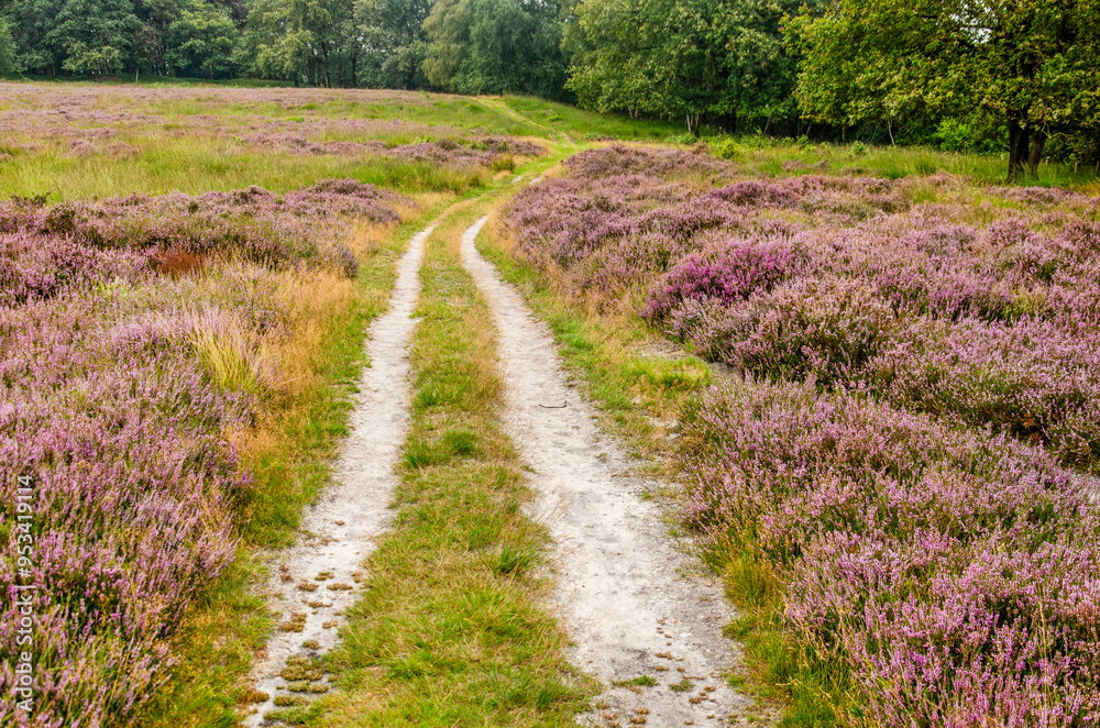 Dirt track between field of heath, leading to a forest, in Overijssel, The Netherlands