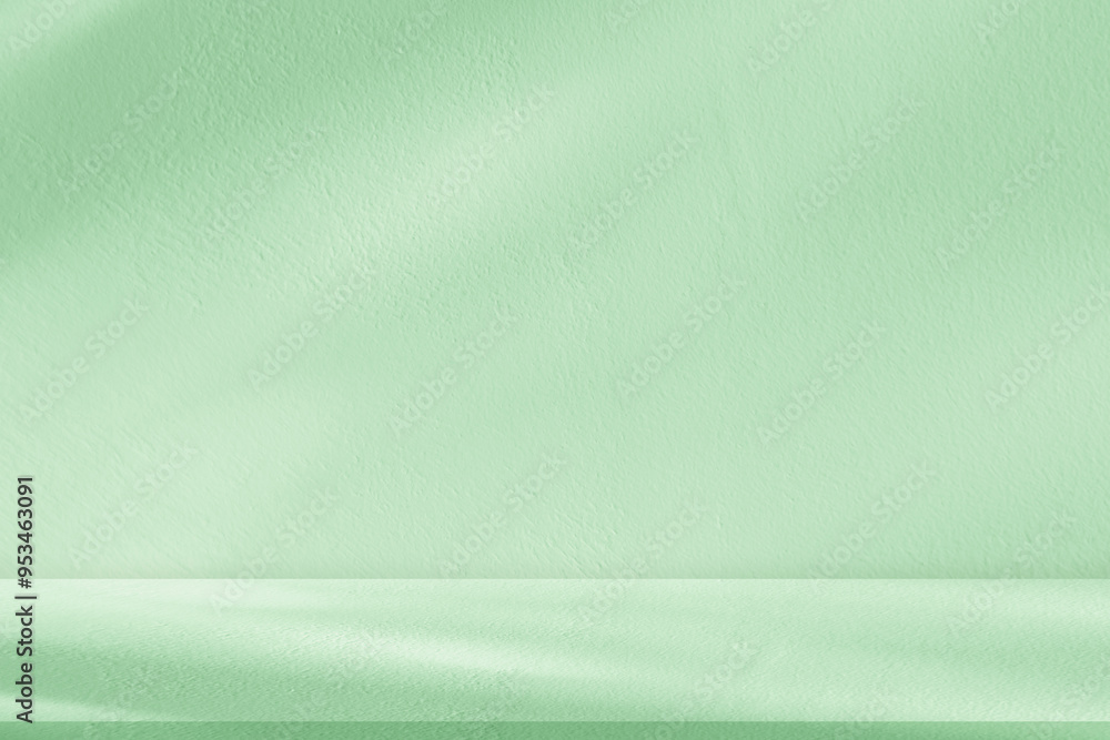 Background Green Studio Room with Nature light,Shadow on Podium Display for Cosmetic Product.Summer Backdrop with Shadow leaves on concrete wall,floor texture,Empty light green background platform