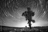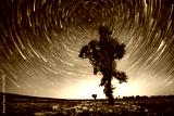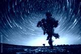 Silhouettes of two trees in the night, with star trails and a warm glow on the horizon. The trees looks like a giant football or soccer player and a ball being kicked.