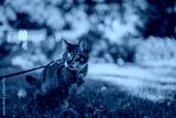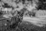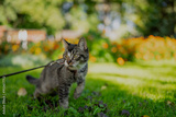 Lovely small cute striped cat on a home owner leash in green garden and flowers in the background