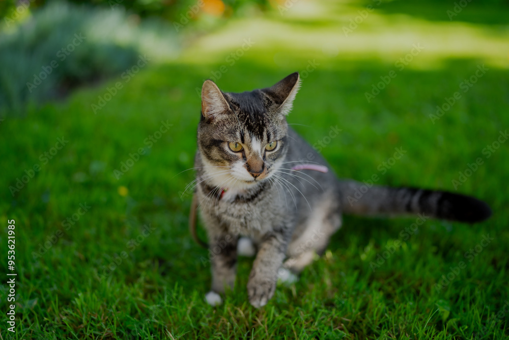 Lovely small cute striped cat on a home owner leash in green garden and flowers in the background