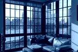 A cozy living room with large windows offering views of the New York City skyline. Highlighting urban architecture and nature
