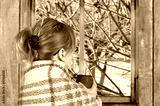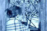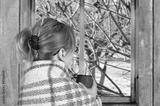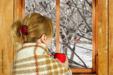 Girl drinking coffee or tea at the window watching the winter