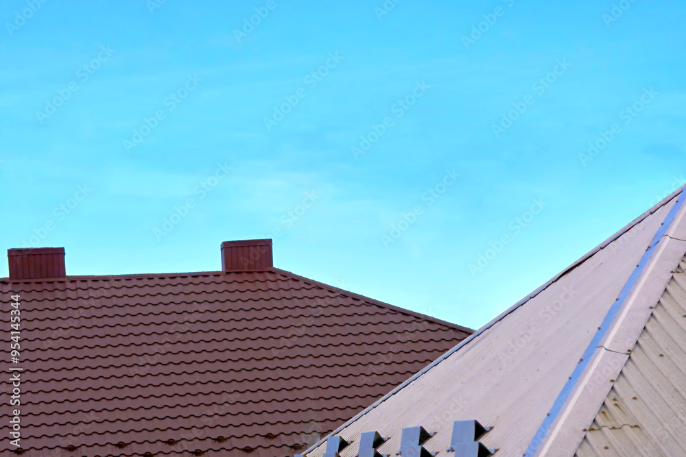 Plastic metal tile profile on the roof of a house and blue clear sky