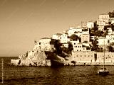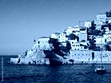 Hydra island port and sea view in sunset colors. Saronic Gulf, Greece