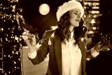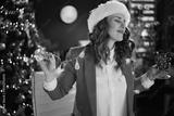 business woman in green office with Christmas tree dancing
