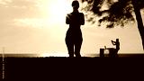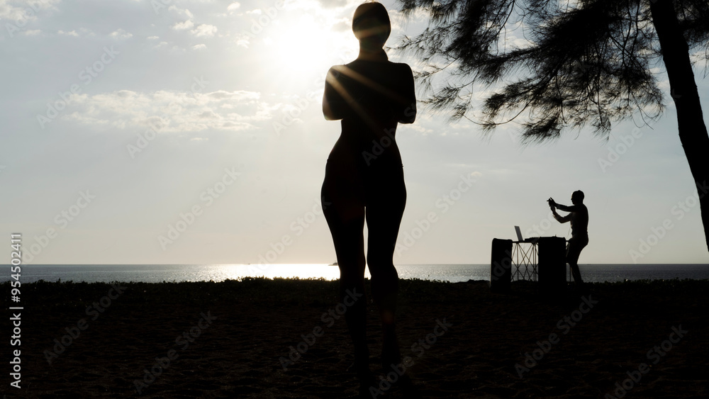 Woman dancing on the beach by the sea to music