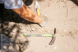 arm of an archeologist in an archeological excavation on the side of the floor there are two tools, a small pickaxe and a trowel.
