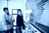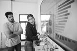 Young indian woman explaining company growth strategy through presentation to colleague on wall tv in office. analysis, statistics charts and graph concept.
