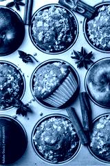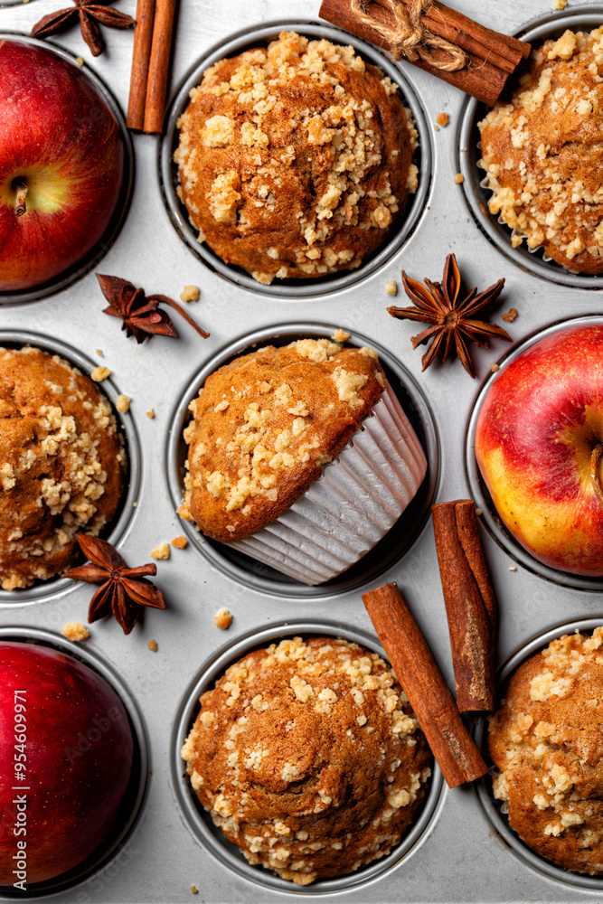 Closeup of baking tray with just cooked apple cinnamon streusel muffins. Autumn pastry background. Homemade bakery.
