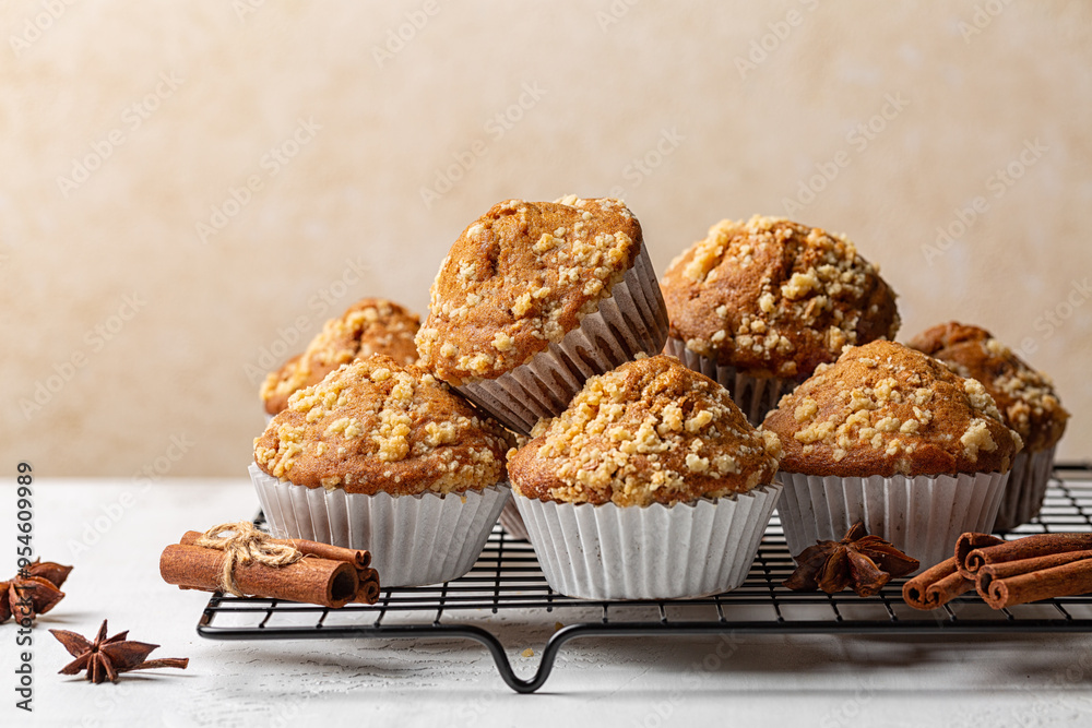 Cinnamon streusel muffins or mini cakes. Homemade bakery. Beige background.