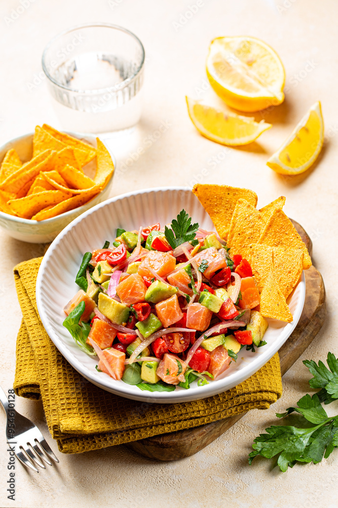 Table with salmon ceviche, a fish dish, salmon marinated in citrus and seasonings, avocado, tomato and red onion. Corn chips nachos, lemons. Peruvian, Mexican, Latin-American countries dish.