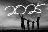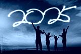 Silhouette of happy family standing on the beach while celebrating new year of 2025 at dusk time