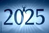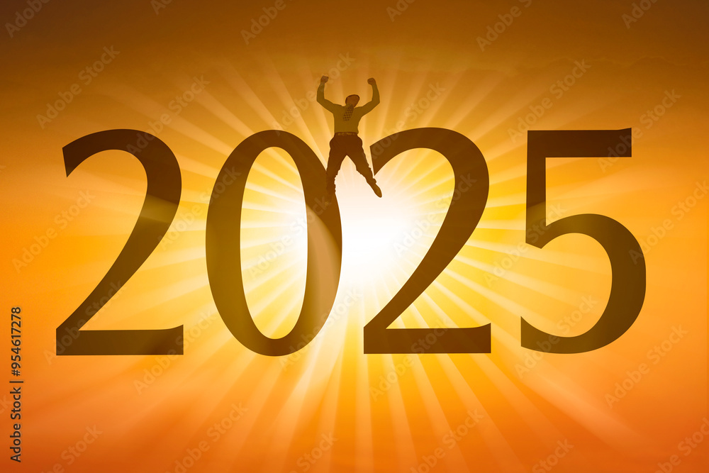 Silhouette of male entrepreneur celebrating his success while jumping above number 2025 with light background