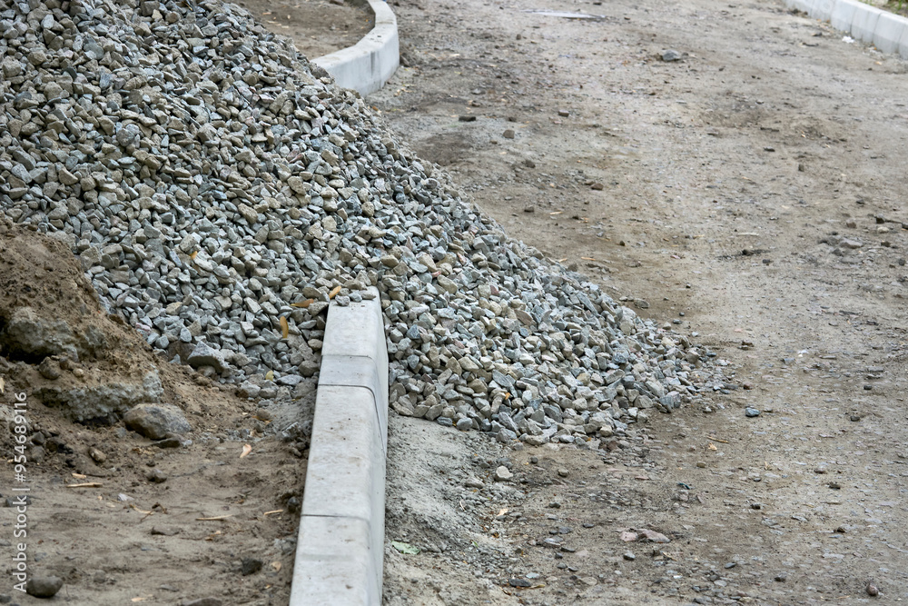 Roadbed with crushed stone prepared for asphalt laying