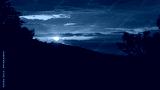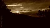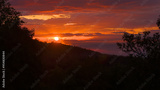 LENS FLARE, SILHOUETTE: Setting sun and sky in vibrant shades over forested hills. Breathtaking view with outlines of lush trees against dramatic sky. A wonderful evening over the hilly landscape.