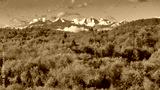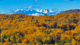 AERIAL: White snowy mountain peaks rise above the colorful autumn wooded hills. An incredibly beautiful blend of vibrantly colored woodland and majestic mountains heralding the changing of seasons.