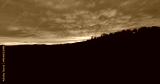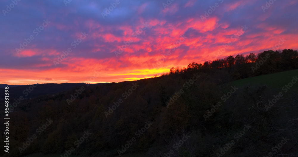 AERIAL: A vibrant sunset over an autumn forest, painting sky in shades of orange, pink, and purple. Picturesque rural landscape under a colorful dramatic sky. Mesmerizing sunsets in the countryside.