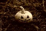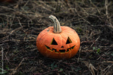 Carved evil pumpkins for Halloween on the autumn field in the dry grass in dark.