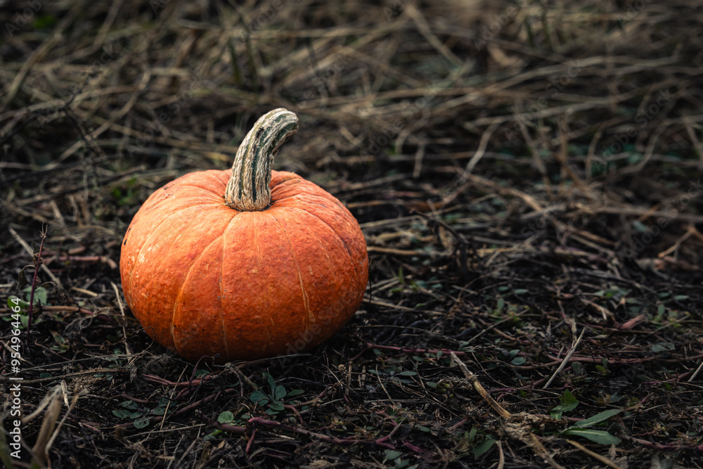 One big orange pumpkin on the green grass field background. Autumn season. Thanksgiving day. Farm harvest. Copy space. Banner. Landscape. Beautiful panoramic card. Nature decoration. Vegetables.