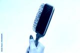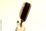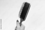 A red hairbrush in woman hand with red nails isolated on a white background. Hair tools.