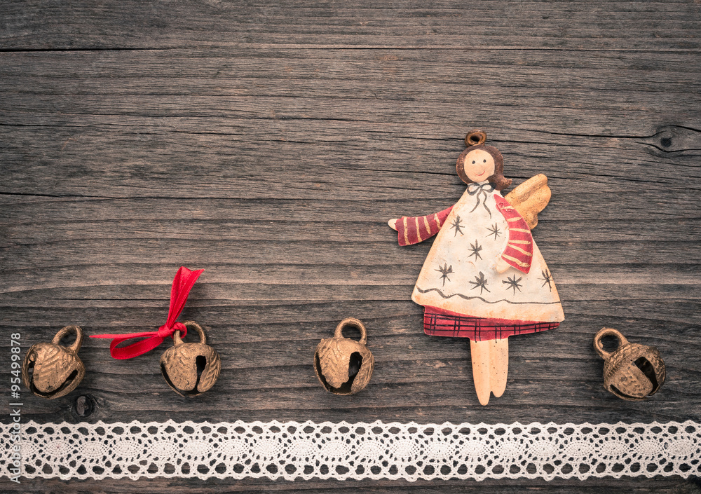Christbaumschmuck aus Metall, Engel, Schellen, Holzgrund, Weihna