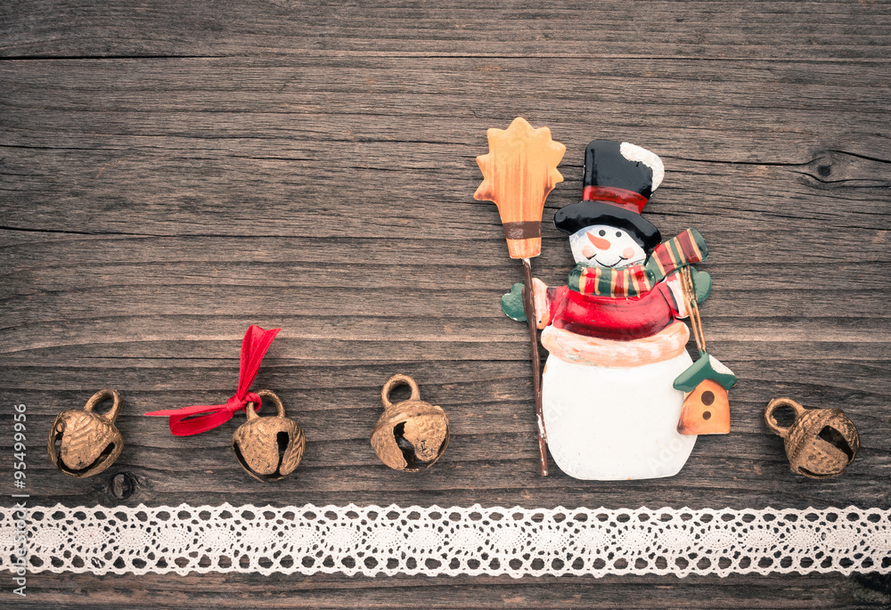Christbaumschmuck aus Metall, Schneemann, Schellen, Holzgrund, W