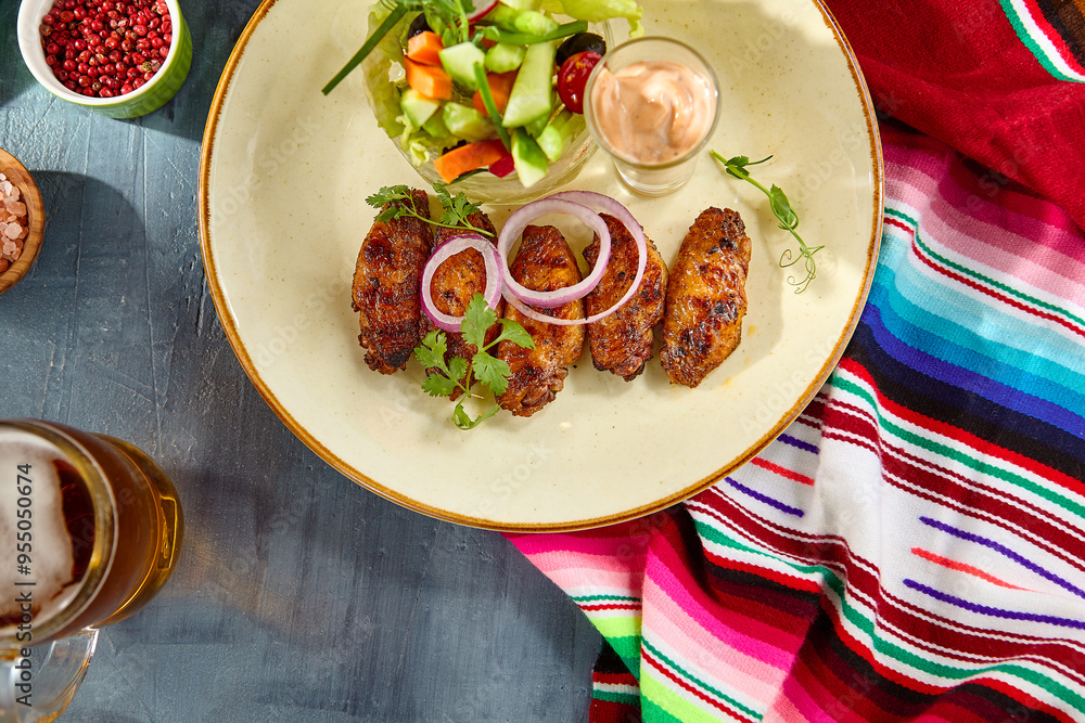 Buffalo Wings with Cocktail Sauce and Vegetable Sticks - Savory Appetizer with Vibrant Veggies