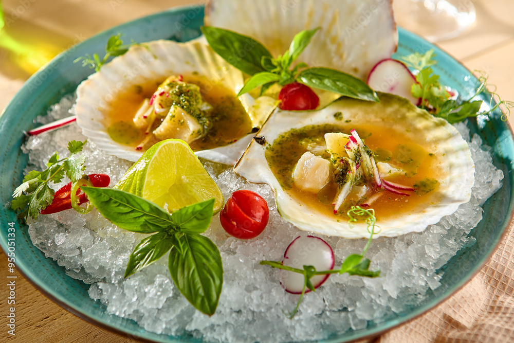 Scallop Ceviche Served on Ice in Shells with Fresh Herbs and Garnish