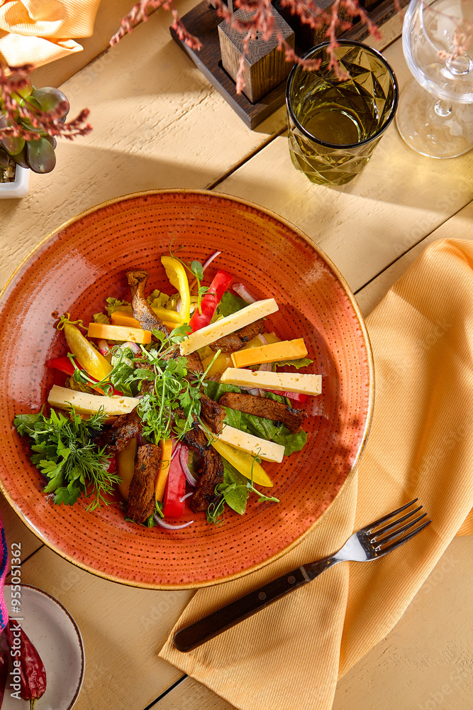 Fresh Beef Steak Salad with Cheese and Vegetables - Gourmet Cuisine on a Rustic Plate