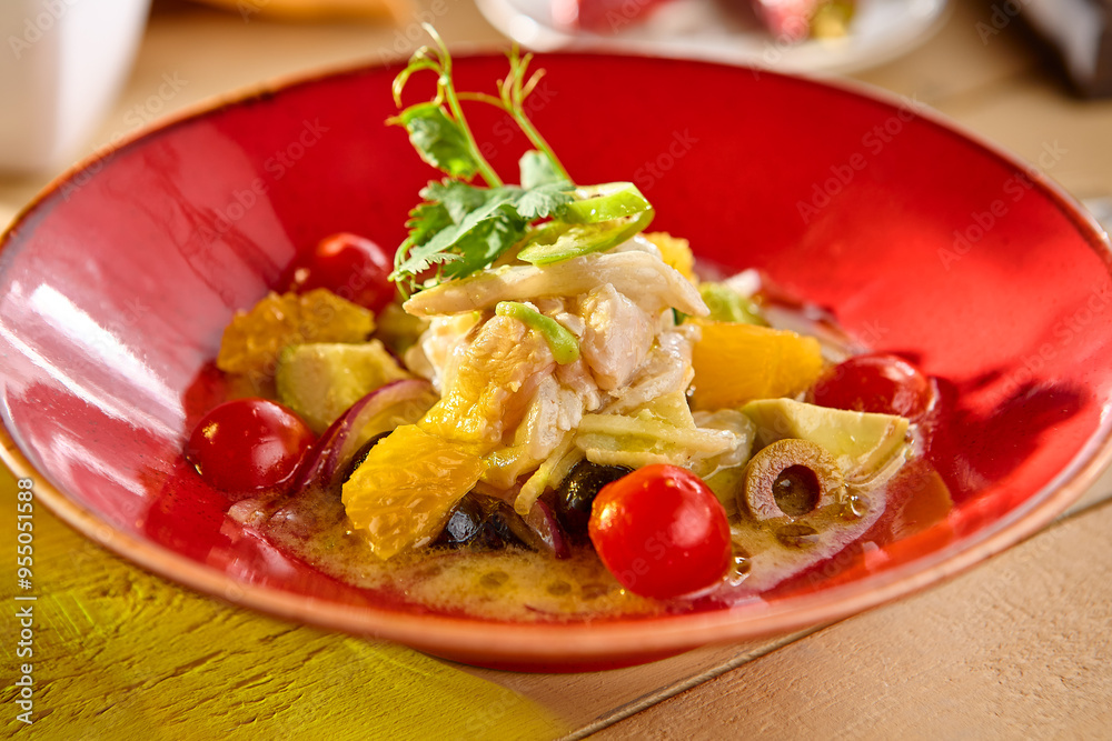 Fresh Fish Ceviche with Olives, Orange, Avocado, and Tomatoes in Red Bowl