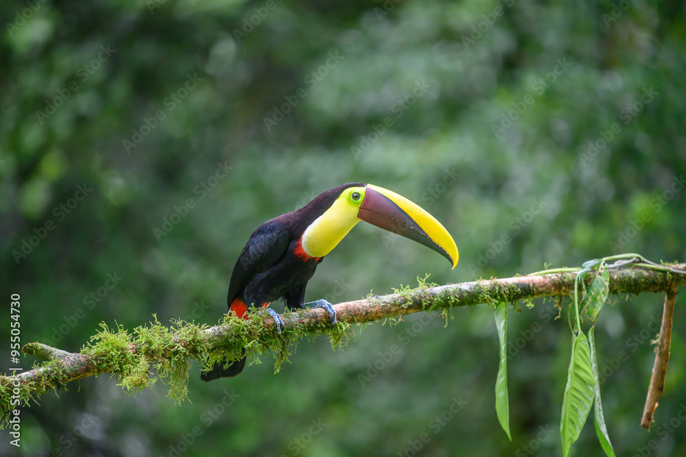 Bird with open bill, Chesnut-mandibled Toucan sitting on the branch in tropical rain with green jungle in background. Wildlife scene from nature.