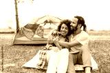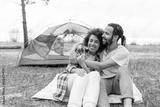 young african american couple tourists with camping equipment sitting near tent in forest and hugging, man and woman relaxing with tents at camping site