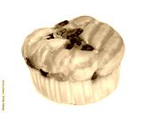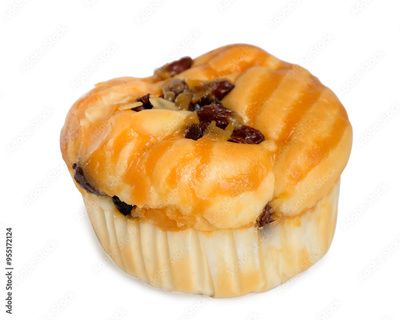 Bread mixed with raisins and caramel almonds on white background.