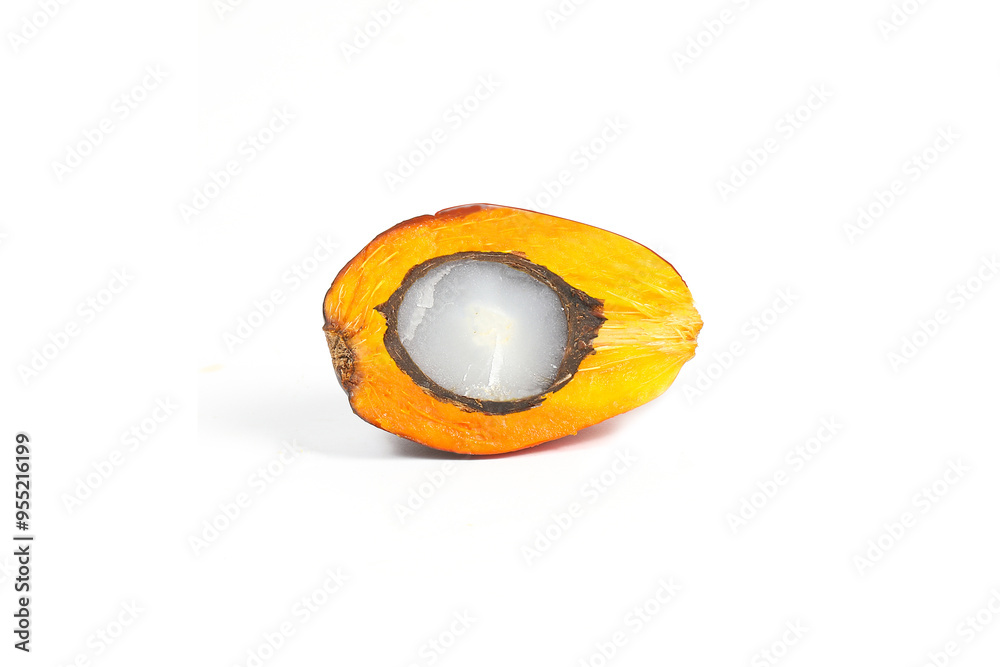 Oil Palm Fruit ripe inside of sliced oil palm fruit cut in half isolated in white background