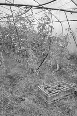 Tomatoes in boxes in a greenhouse, organic cultivation, selective focus.